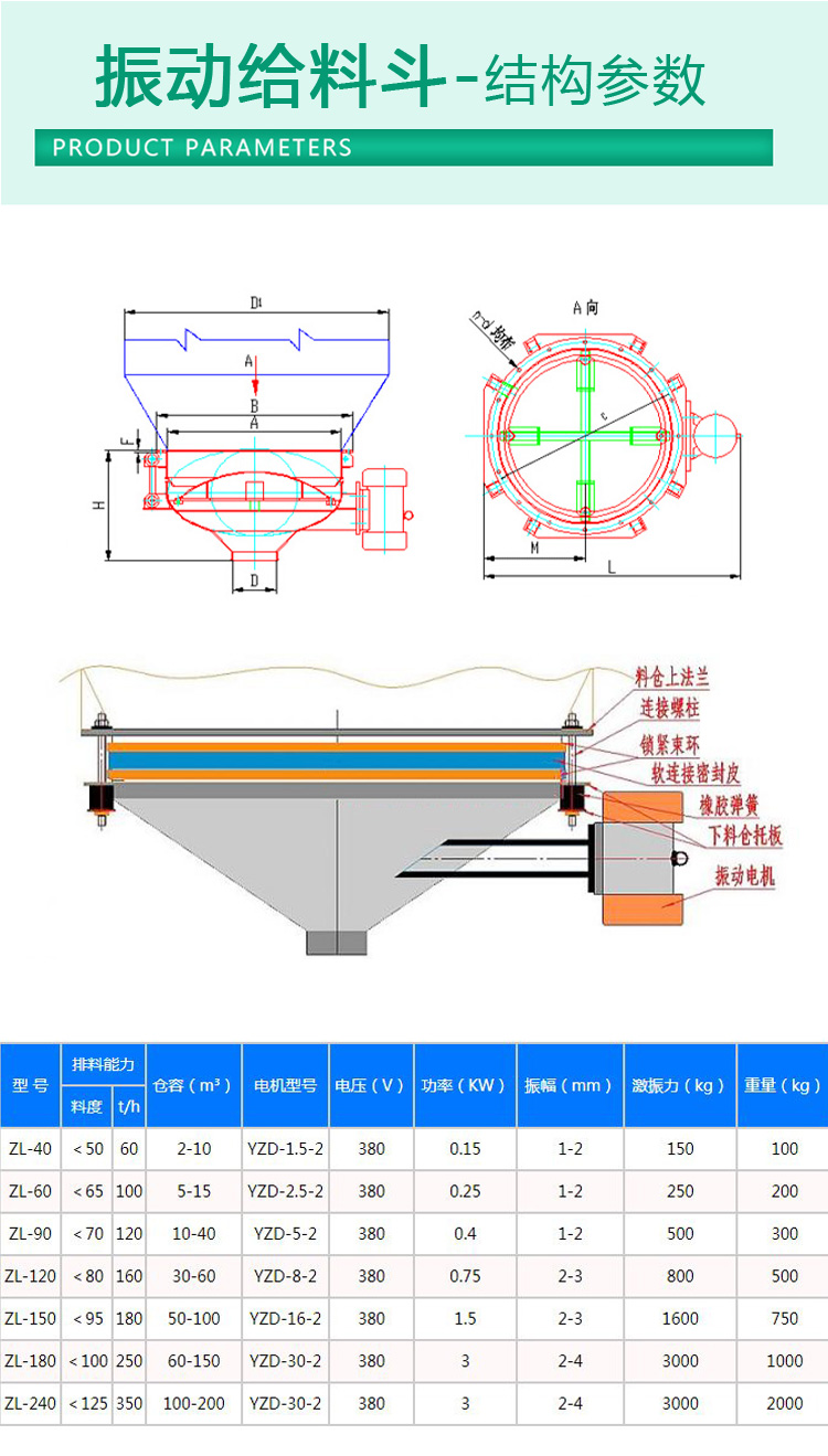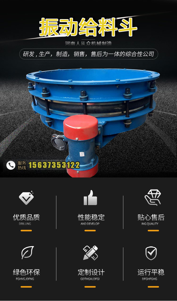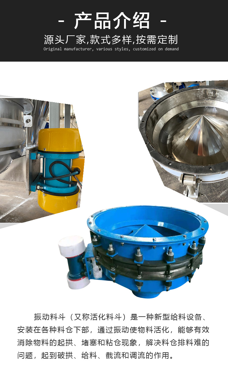 振動給料斗又稱活化料斗,大多數料斗為圓盤式,通常安裝在各種料倉的下部。通過振動使物料活化,可以有效消除物料起拱、堵塞和粘附,解決料倉卸料困難的問題。
