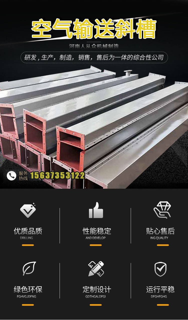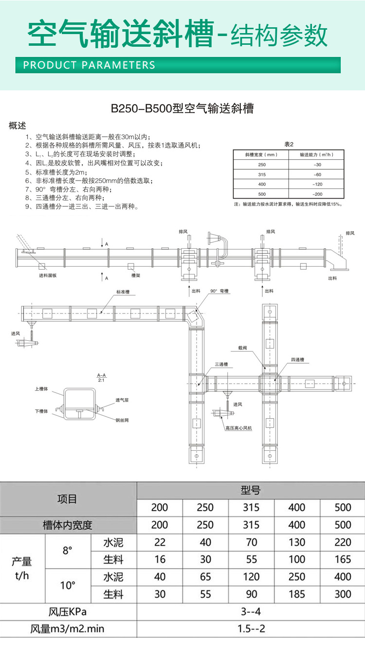 B200-B500空氣斜槽生產廠家,主要型號分別為:B200,B250,B315,B400,B500等;密封性能好,輸送產量大,可定制生產。