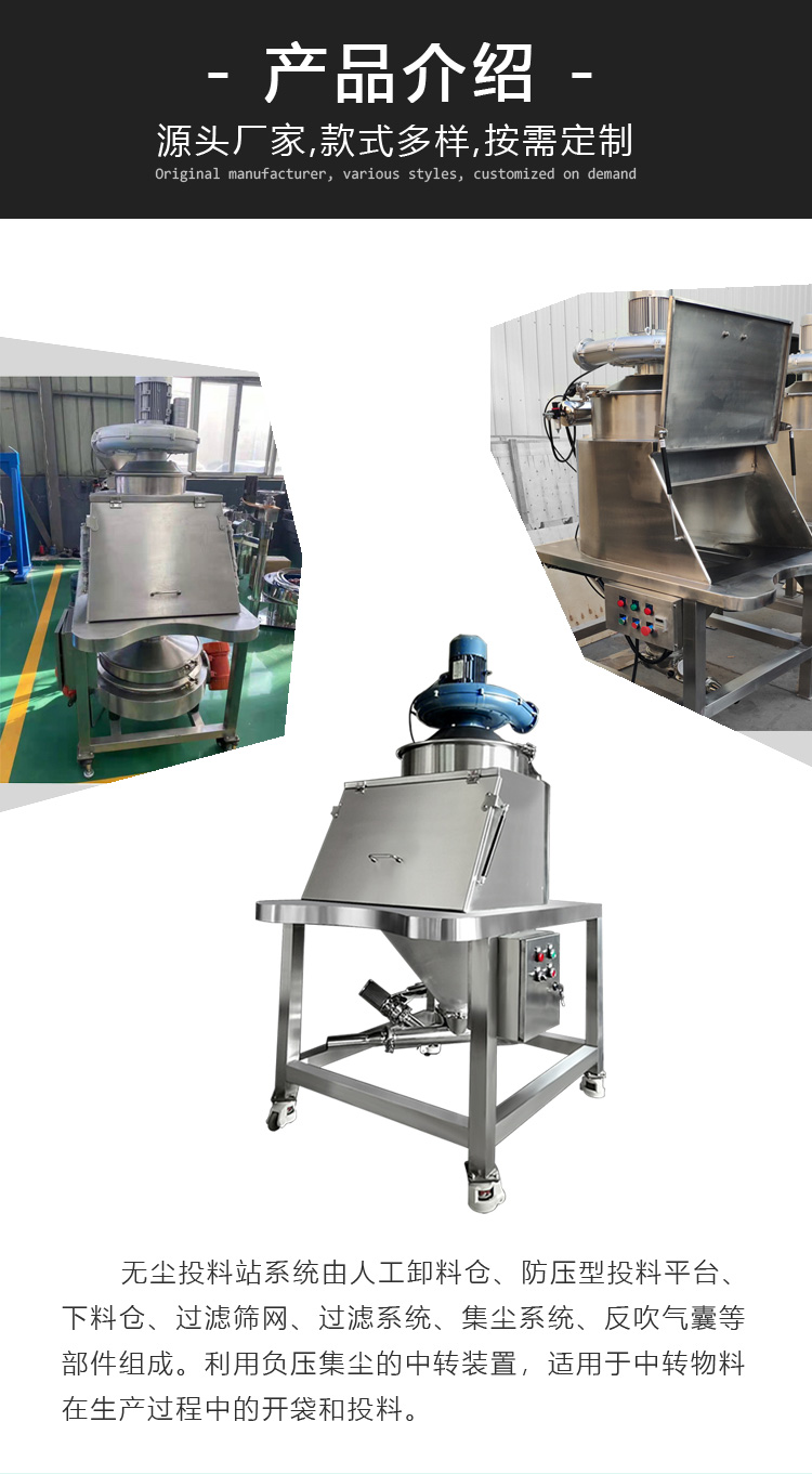 無塵投料站適用于生產(chǎn)過程中物料的開袋和投料,廠用于制藥、化工、食品行業(yè)等。特別適用于手動人工喂料和粉末材料的預(yù)篩選。集塵風(fēng)機可避免物料粉塵四處飛揚。
