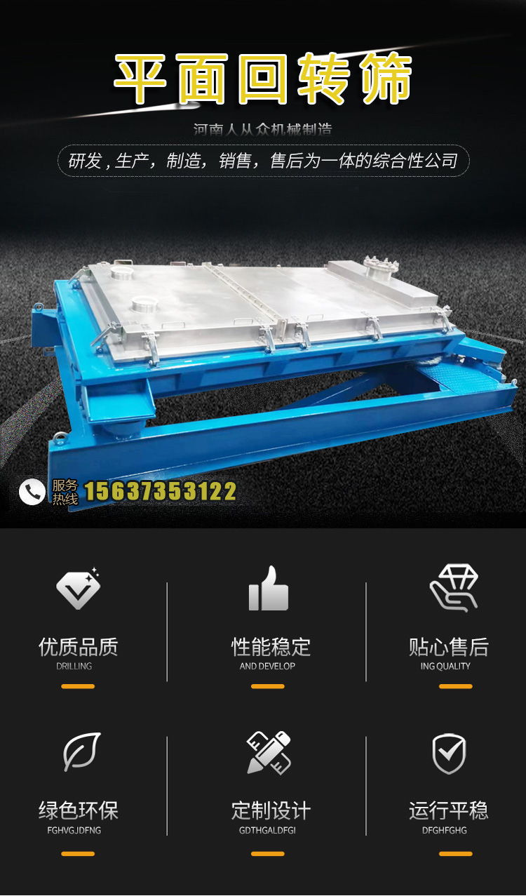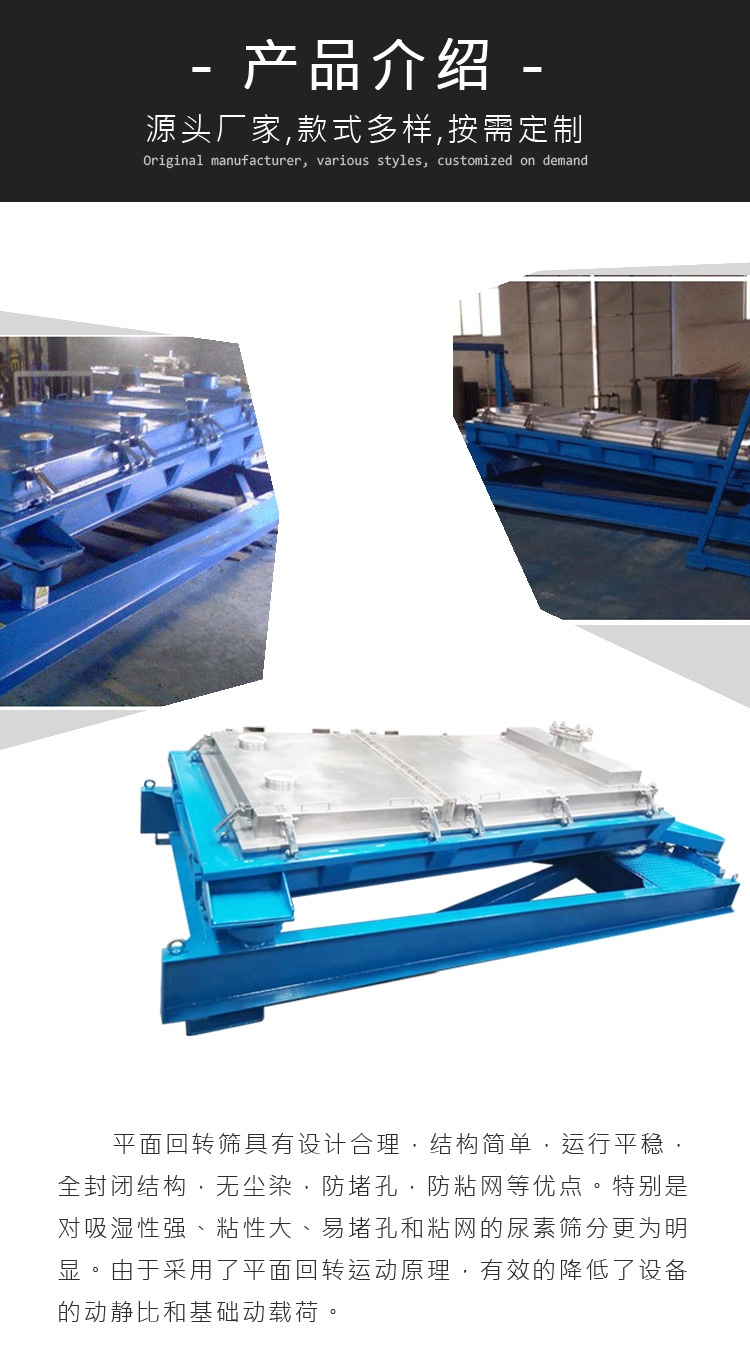 平面回轉(zhuǎn)篩相比于傳統(tǒng)直線振動(dòng)篩,篩分效率進(jìn)一步提升,其采用了平面回轉(zhuǎn)運(yùn)動(dòng)的原理,降低了設(shè)備的動(dòng)靜比和基礎(chǔ)動(dòng)載荷,篩分面積更大,噪音更小,篩網(wǎng)壽命更長(zhǎng),廣泛應(yīng)用于化工、建材、糧食等行業(yè)。