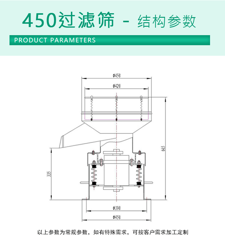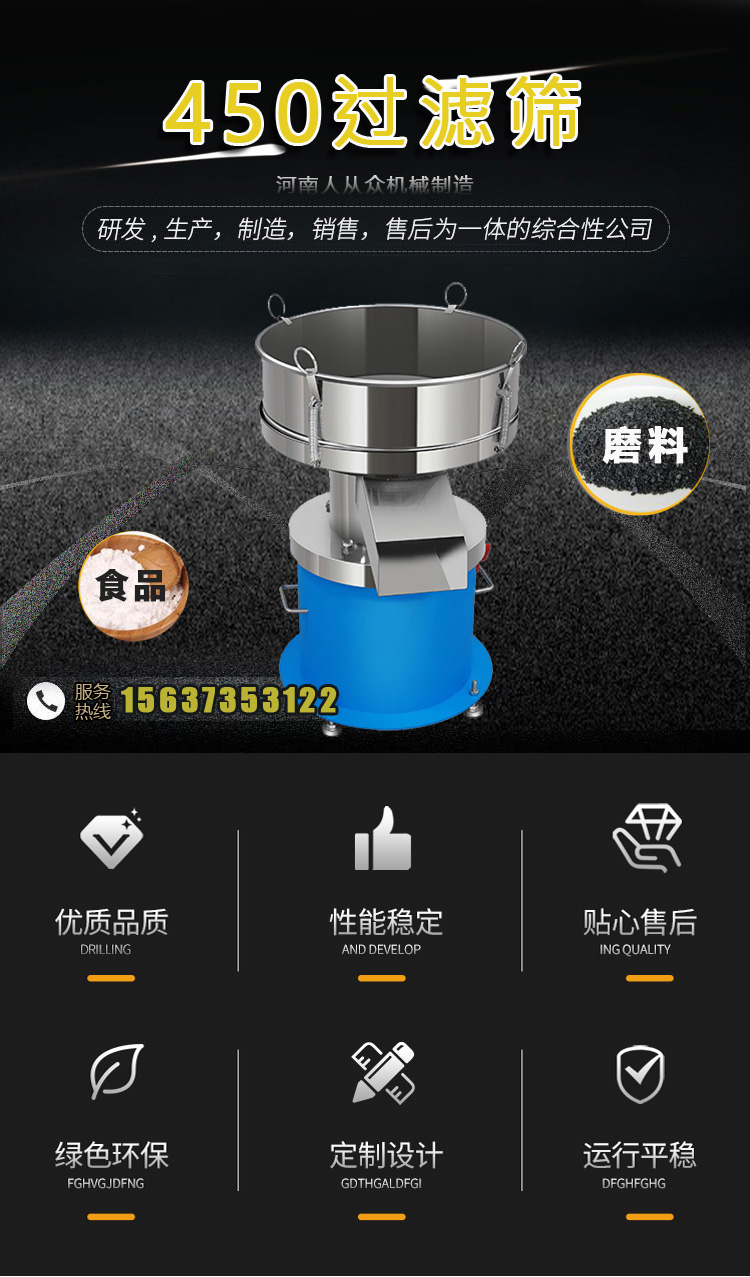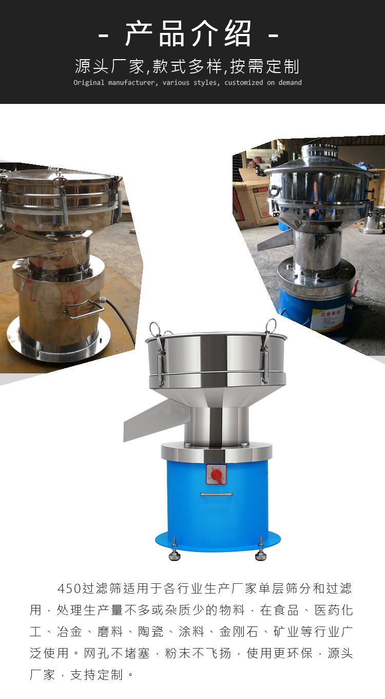 450過濾篩適用于產(chǎn)量要求不大或雜質(zhì)較少的物料,如食品行業(yè)果汁、豆?jié){、奶粉、醬油醋、糖、鹽等物料,造紙行業(yè)的各種涂料、泥漿、廢液等物料,冶金行業(yè)的各種金屬粉末等物料;醫(yī)藥行業(yè)的各種顆粒粉末的篩分等。