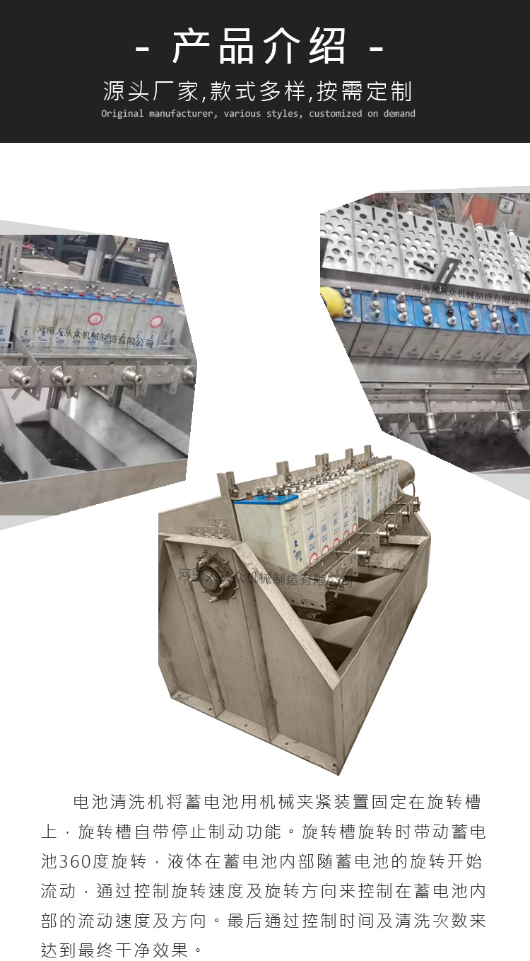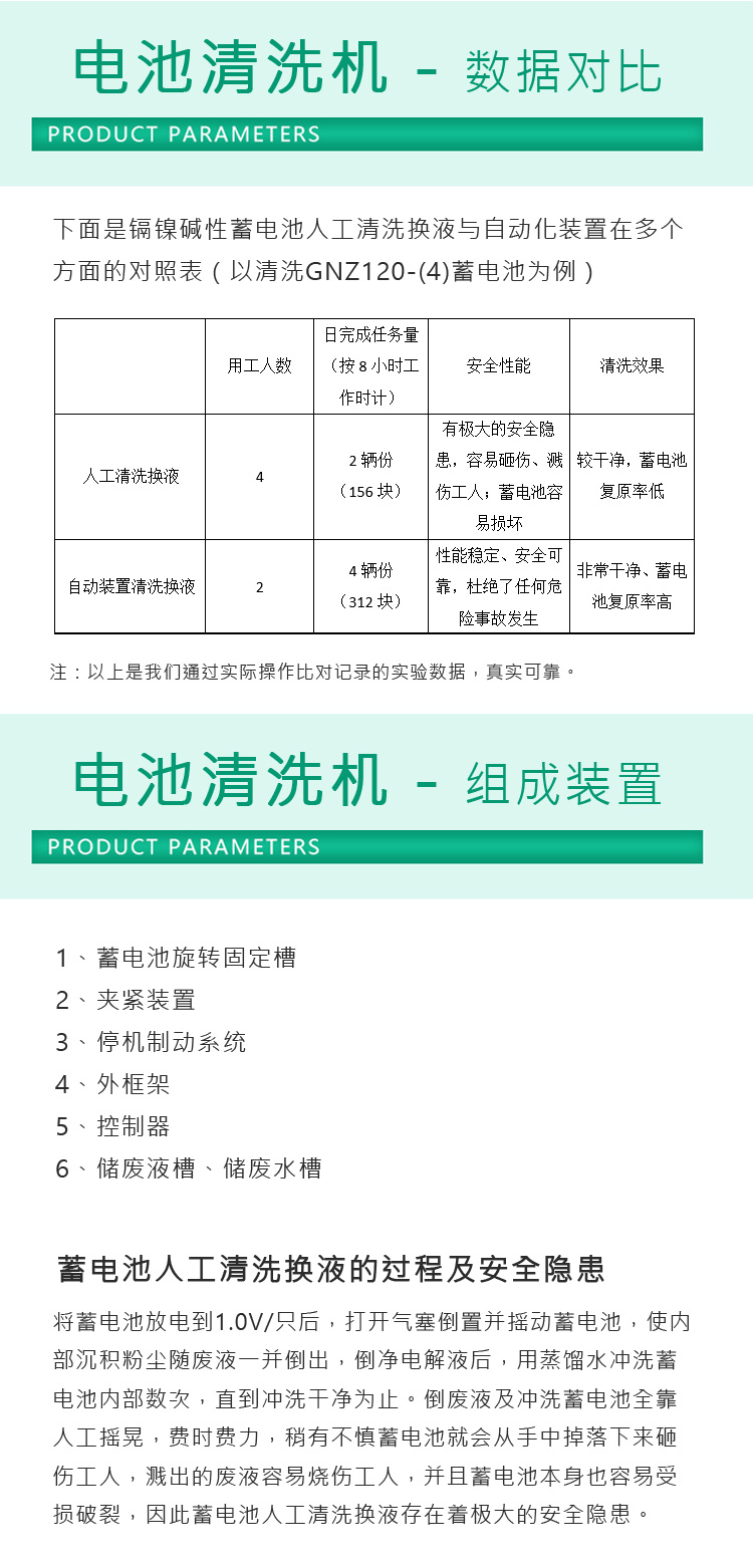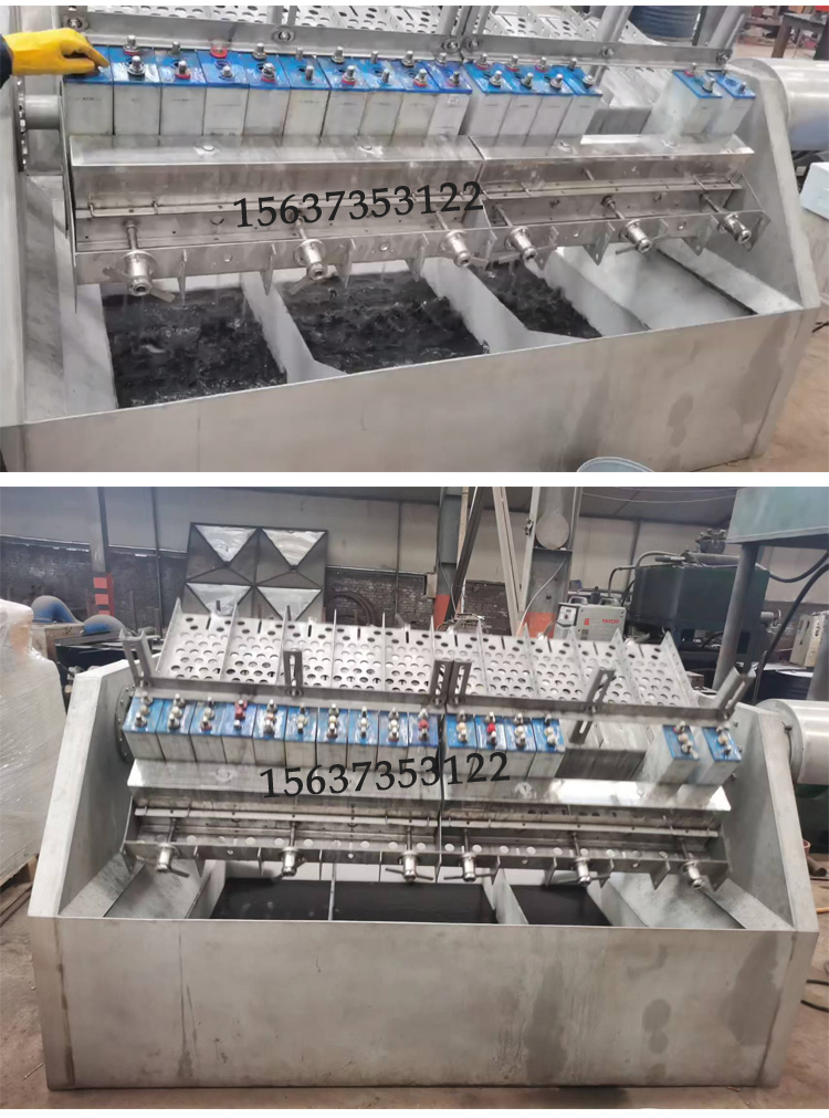鎘鎳堿性蓄電池清洗換液設(shè)備將蓄電池用機(jī)械夾緊裝置固定在旋轉(zhuǎn)槽上,旋轉(zhuǎn)槽自帶停止制動功能。旋轉(zhuǎn)槽旋轉(zhuǎn)時帶動蓄電池360度旋轉(zhuǎn),液體在蓄電池內(nèi)部隨蓄電池的旋轉(zhuǎn)開始流動,通過控制旋轉(zhuǎn)速度及旋轉(zhuǎn)方向來控制在蓄電池內(nèi)部的流動速度及方向。最后通過控制時間及清洗次數(shù)來達(dá)到最終干凈效果。對蓄電池的極板無任何損傷,排除了人工清洗的安全隱患。