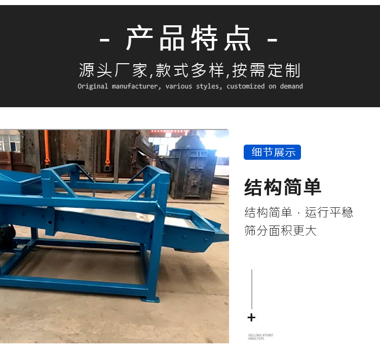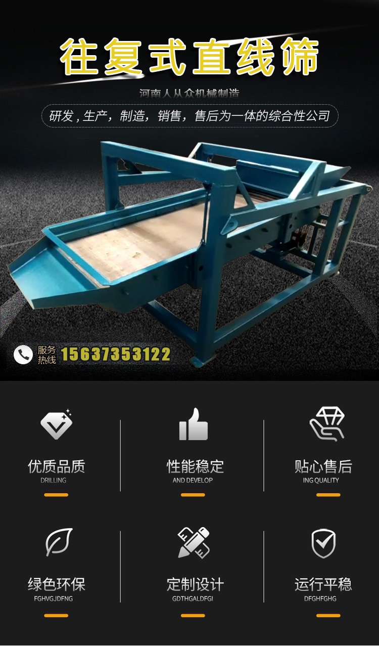 往復式直線篩也叫平面往復篩,其特點篩分產量大,換網方便,通常適用于要求不高、又有一定處理量的工業化顆粒分離。廣泛用于化工、建筑、礦山、煤礦等行業