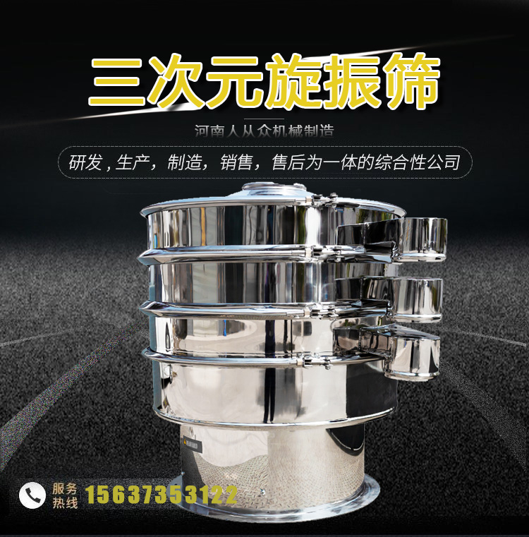 粉末顆粒振動(dòng)篩的運(yùn)動(dòng)軌跡是一條復(fù)雜的三維曲線。水平面上的投影是圓,在兩個(gè)垂直面上的投影是兩個(gè)相同的橢圓。通過調(diào)整振動(dòng)電機(jī)上下端偏心塊的相對(duì)相位,可以改變物料在篩面上的運(yùn)動(dòng)軌跡,從而達(dá)到不同的篩分目的;適用于面粉、淀粉等粉狀物料和各種顆粒狀物料的篩分。